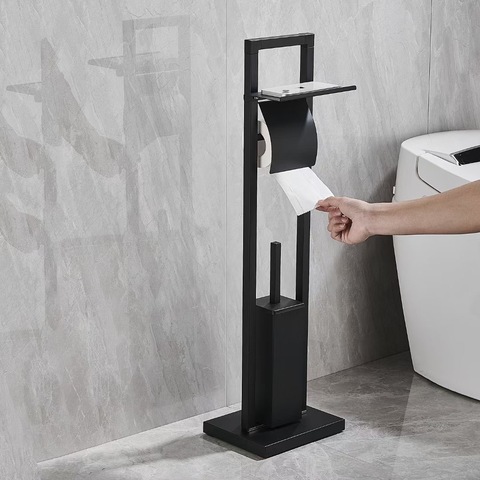 Soporte de papel higiénico independiente negro mate de nuevo diseño 2025 Construcción de Metal con cepillo integrado y portarrollos de repuesto